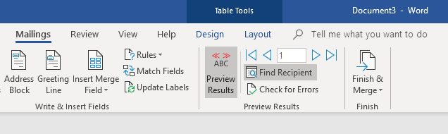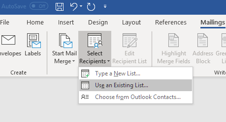 Stel de bron van gegevens in met "Select Recipients" - "Use an Existing list...", en selecteer het gemaakt Excel bestand