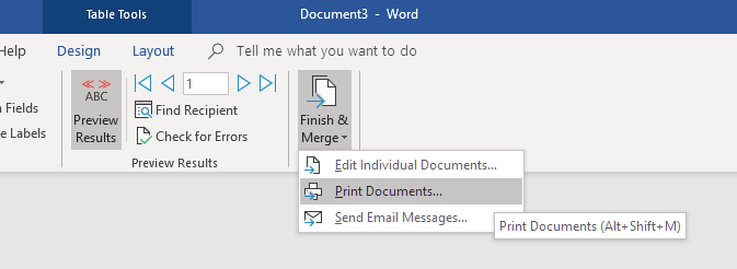 Met "Finish & Merge" kan je de label effectief printen met de label printer. Selecteer hierbij de geïnstalleerde label printer.