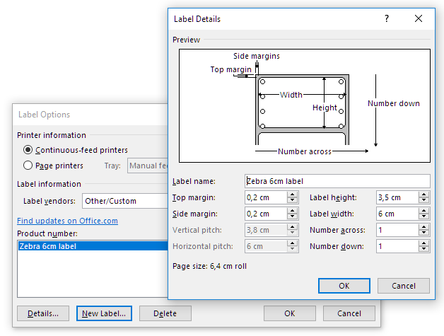 Selecteer "Continuous-feed printers" en stel de juiste afmetingen van de gebruikte labels in